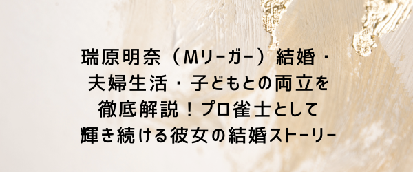 麻雀プロ・Mリーガーとして活躍する瑞原明奈さん。競技麻雀の第一線で戦いながら、結婚・出産・家庭との両立を果たしている姿は、多くのファンから称賛を集めています。本記事では瑞原明奈の結婚を軸に、結婚時期、夫(結婚相手)、子ども、馴れ初め、仕事との両立、までを調べたのでお伝えしますね。